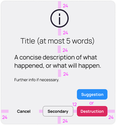 Dialogs interrupt users with urgent information, details, or actions. Common usage includes confirming a destructive action, or informing the user of something instantly.