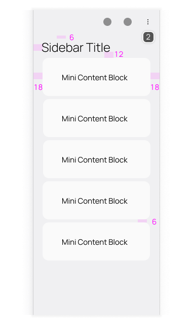 - Elements below the Sidebar have 6dp spacing between them, irregardless if they're Items or Mini Content Blocks.